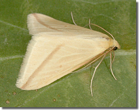 Straw Belle Aspitates gilvaria, but Vestal is smaller and rests with tent-like resting posture, while Straw Belle is usually speckled. Larva feeds on Knotgrass, but unable to over-winter in significant numbers.