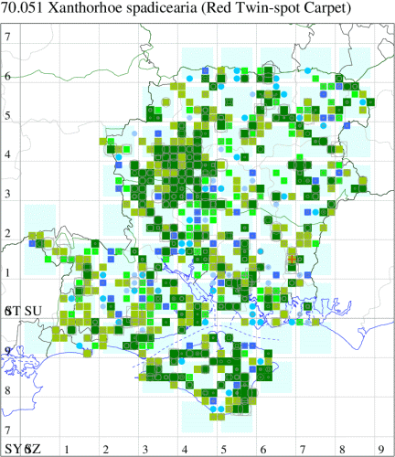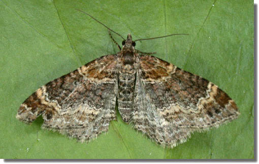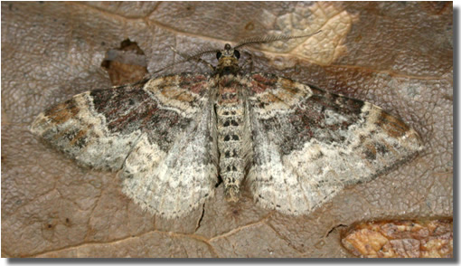 Dark-barred Twin-spot Carpet X. ferrugata, the notch on the inner edge of the cross-band, close to the costa, has proven to be unreliable, and only moths with black cross-bands can be assigned to this species without dissection of the genitalia. Larva feeds on Bedstraw, Ground-ivy and Dock, over-wintering as a pupa.