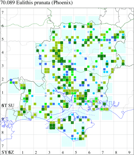 Common in gardens, allotments and woodland throughout the British Isles. In Hampshire and on the Isle of Wight appears to be one of the species which is benefiting from the increase in average summer temperatures in recent years, with a marked increase apparent in the last ten years. Wingspan 37-42 mm. Could be confused with a late flying