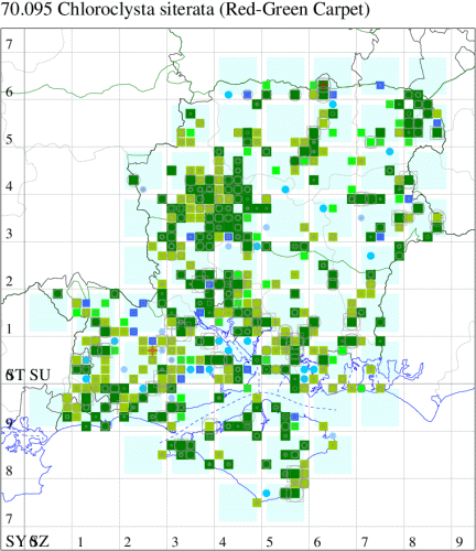 Autumn Green Carpet C. miata, but that species is larger and paler, and the forewing usually lacks reddish-brown streaks. Larva feeds on Oak, Blackthorn, Apple, Wild Cherry, Japanese Cherry, Dog-rose and Rowan.