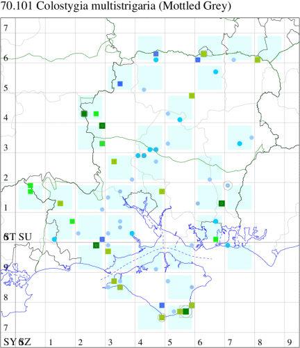 Widely distributed throughout the British Isles on heathland, moorland, downland and woodland margins. In Hampshire and Isle of Wight scattered across the area, but never common and in small numbers. Perhaps overlooked due to its early flight season and nondescript appearance. Wingspan 26-31 mm. Mottled veins are the best distinction from other nondescript spring geometers, such as