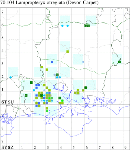 suffumata flies almost a month earlier, so when fresh specimens of Devon Carpet are on the wing, Water Carpet will be almost over.