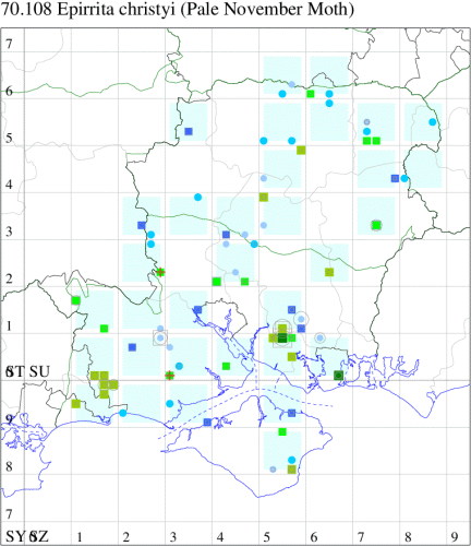 Common in mature beech woodland throughout much of England and southern Scotland, but problems in identifying individuals to specific status mean that all Epirrita species are under-recorded. In Hampshire and on the Isle of Wight the least common of the three Epirrita species to occur in the region. Wingspan 38-42 mm. One of four very similar species of Epirrita found in the UK, which are generally separable only by dissection of the genitalia. Larva feeds on various broad-leaved trees and shrubs, including Beech, Elm, Birch, Alder, Hazel, Sallow and Hawthorn, over-wintering as an egg.
