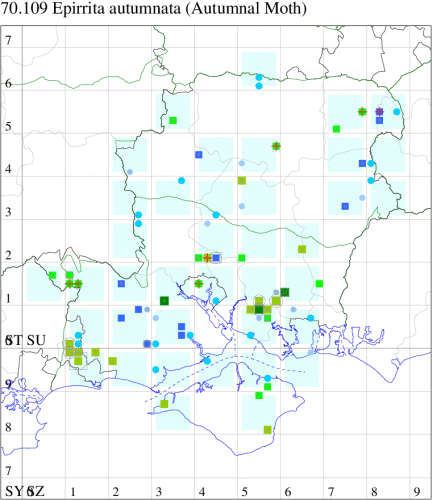 Common in open woodland, woodland rides, birch woodland, gardens and scrub throughout much of the British Isles, but problems in identifying individuals to specific status mean that all Epirrita species are under-recorded. In Hampshire and on the Isle of Wight widespread and common. Wingspan 40-44 mm. One of four very similar species of Epirrita found in the UK, which are generally separable only by dissection of the genitalia. Larva feeds on various broad-leaved trees and shrubs, including Silver Birch, Downy Birch, Alder and Heather, over-wintering as an egg.