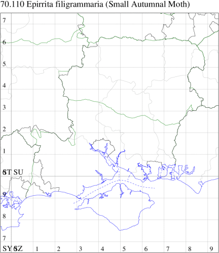 Common on moorland throughout much of Scotland, northern England and Wales, rare elsewhere; problems in identifying individuals to specific status mean that all Epirrita species are under-recorded. Unlikely to be recorded in Hampshire or on the Isle of Wight. Wingspan 30-38 mm. One of four very similar species of Epirrita found in the UK, which are generally separable only by dissection of the genitalia. Larva feeds on Heather, Bilberry and Sallow, over-wintering as an egg.