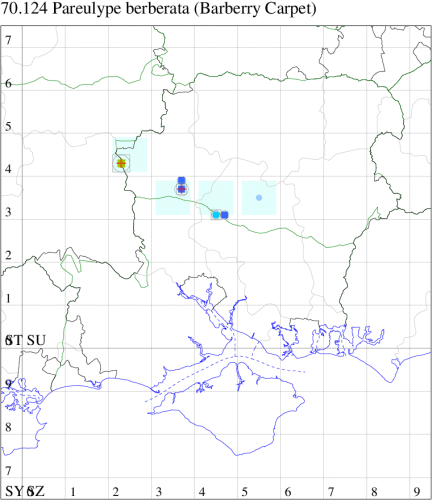 In Hampshire, it was probably never widespread. Goater (1974) gave the following account: "Romsey; Winchester (?VC) not uncommon in our lanes, c. 1891 (Fassnidge)... It is pleasing, therefore to record the rediscovery of the species on the mainland of Hampshire in 1969, in a locality where a single specimen had been taken in 1940. Small numbers were seen again in 1970 and 1971." Further to this, Goater and Norriss (2001) reports that "the Berberis bushes in the one known locality in Hampshire were severely burnt when a stubble fire got out of control in the early 1970s and the colony... was almost certainly destroyed". This locality remains unknown to this day. More recently, it was at least temporarily present on the Leckford Estate between 1990 and 1992, when two larvae were found, but there have been no subsequent records, although it was the subject of a failed introduction to the Cholderton Estate on the western border of Hampshire in 2012 (see