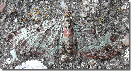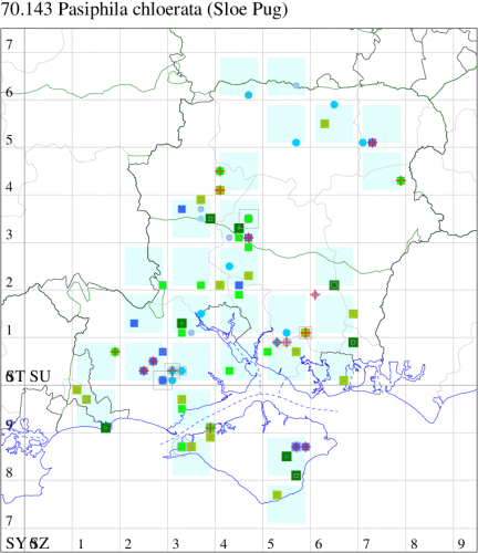 Green Pug P. rectangulata, but that species has postmedian line strongly toothed near costa, and Sloe Pug usually has salmon-pink (black in Green Pug) band at base of abdomen. Larva feeds on flowers of Blackthorn, over-wintering as an egg.