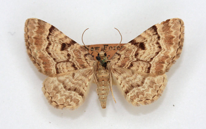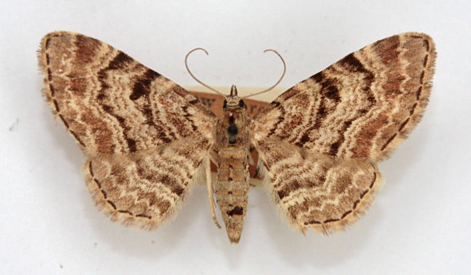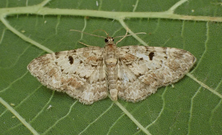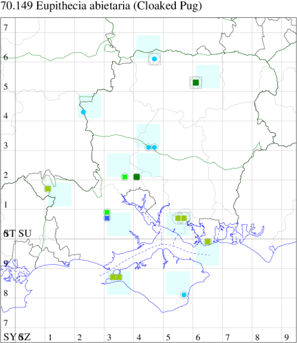 Uncommon, in coniferous woodland and plantations, in northern England and mid-Wales, with a thin scattering of records elsewhere. In Hampshire and on the Isle of Wight the occasional records of this species in the area suggest migration, but it is possible that a resident population occurs, as it evidently did at one time in the New Forest. There seems to have been an upturn in records in the 21st Century, and 2012 saw a minor influx with five sightings across all vice-counties. Further reports came in 2019 and 2023. Wingspan 21-25 mm. Large size and prominent discal spot make this a fairly distinctive pug. Larva feeds within young shoots of various coniferous trees, including Norway Spruce, Sitka Spruce, European Silver-fir and Noble Fir, over-wintering as a pupa.