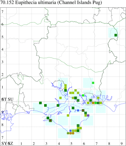 Thyme Pug E. distinctaria, but smaller and lacking the black fascia of Thyme Pug. Larva feeds on Tamarisk, over-wintering as a pupa.