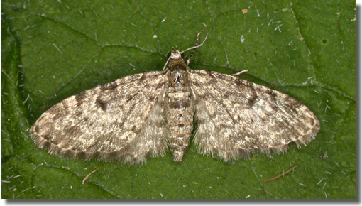 Oak-tree Pug E. dodoneata, which has a number of black dashes along the veins beyond the discal spot, and buff-coloured border alongside the costa and dorsum. Larva feeds on various coniferous trees, including Norway Spruce, Sitka Spruce and Douglas Fir, over-wintering as a pupa.