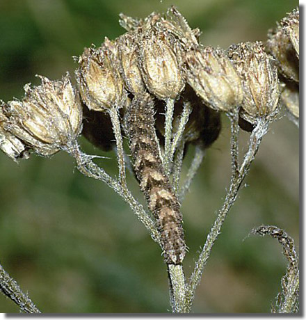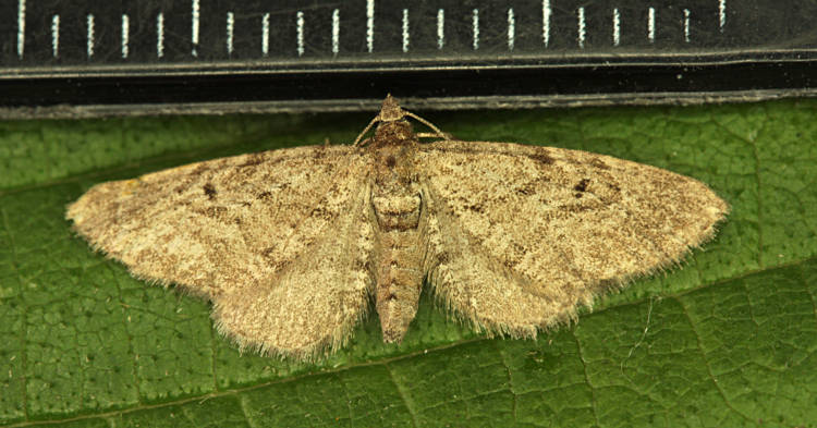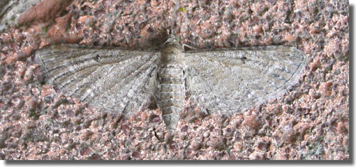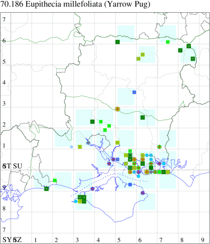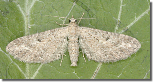Grey Pug E. subfuscata, but Yarrow Pug has a less rounded forewing and is less uniformly grey. Larva feeds on flowers and seedheads of Yarrow, over-wintering as a pupa.