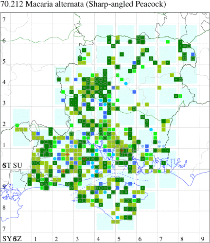 M. alternata there is usually an indistinct grey band running through the blotch in the centre of the forewing, across both forewing and hindwing, and the apical markings are bolder, accentuating the more pointed apex and deeper notch in the termen. Larva feeds on Sallow, Blackthorn, Sea Buckthorn and Alder, over-wintering as a pupa.