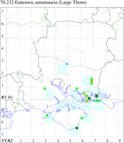 Nationally scarce (Nb) in broad-leaved woodland, scrub and gardens in parts of south-eastern England. In Hampshire largely confined to the extreme south-east corner of the county, on Hayling and Portsea Islands, with occasional wanderers elsewhere in the south of the county and on the Isle of Wight. Wingspan 49-64 mm. Speckled appearance and large size should preclude confusion with other 'thorns'. Larva feeds on various broad-leaved trees and shrubs, including Birch, Alder, Hazel, Hawthorn, Blackthorn and Poplar, over-wintering as an egg.