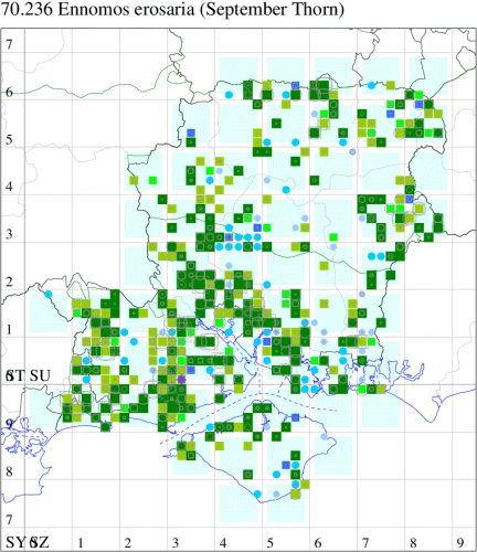 Common in woodland, parks and gardens throughout much of England, spreading into Scotland, a species of conservation concern under the UK Biodiversity Action Plan. In Hampshire and on the Isle of Wight Common and widespread. Although the flight-time histogram shows a smooth curve of emergence, in most years there are two peaks, one in July and another, usually smaller, in September. Wingspan 38-42 mm. The most likely confusion species is