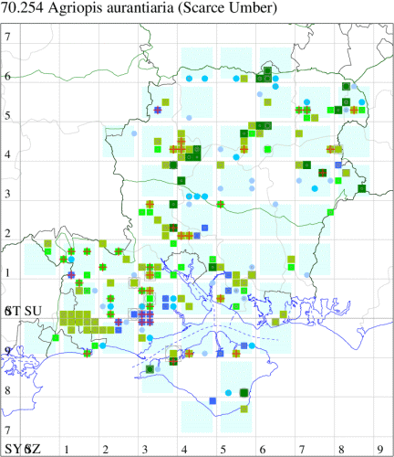 Common despite its name, in broad-leaved woodland, scrub and gardens throughout the British Isles. In Hampshire and on the Isle of Wight widespread and fairly common, although no doubt under-recorded due to its late season. Wingspan male 40-44 mm, female wingless. The main confusion species is
