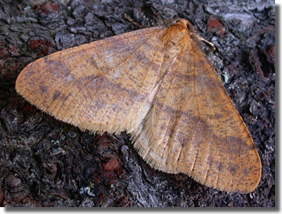 Mottled Umber Erannis defoliaria, from which male Scarce Umber is perhaps most reliably separated by its rounded termen and more open apical angle, but in most cases the uniformly orange-yellow forewing of Scarce Umber distinguishes from the very much more variable Mottled Umber; female Scarce Umber has short wing stumps, absent in Mottled Umber. Larva feeds on numerous broad-leaved trees and shrubs, over-wintering as an egg.
