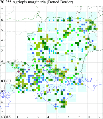 Common in woodland, scrub, hedgerows, gardens, heathland and moorland throughout the British Isles. Widespread and common in Hampshire and on the Isle of Wight. Wingspan male 36-42 mm, female flightless; principal confusion species are