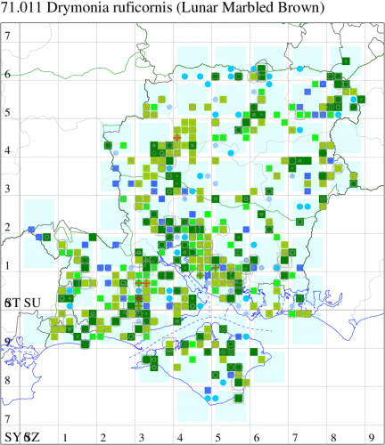 Local in woodland, hedgerows, parks and gardens throughout the British Isles. Widespread and common in Hampshire and on the Isle of Wight. Wingspan 38-46 mm. The principal confusion species are