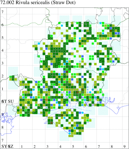 Common in damp grassland, fens, heathland, moorland, woodland and gardens throughout much of the British Isles. In Hampshire and on the Isle of Wight fairly common to common in marshes and bogs and in open, grassy woodland in all three vice-counties. Wingspan 19-25 mm. Unmistakable. Larva feeds at night on False-brome, Tor-grass and Purple Moor-grass.
