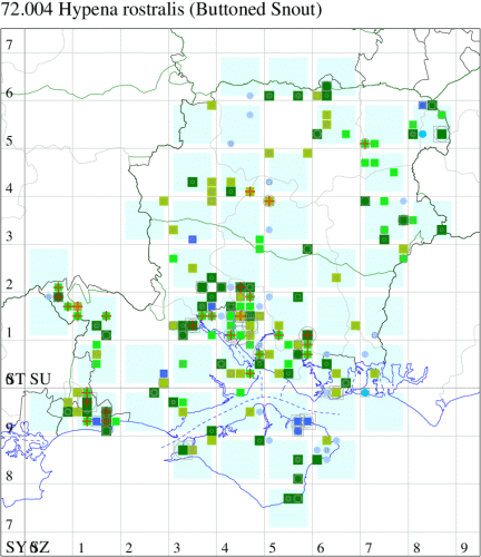 Nationally scarce (Nb) in hedgerows, woodland edges and gardens throughout much of south-eastern England, and a priority species under the UK Biodiversity Action Plan. In Hampshire and on the Isle of Wight very local, but since 1990 there does appear to have been an increase in the numbers reported, with a peak of 44 records in 2001. Wingspan 29-32 mm. The main confusion species is