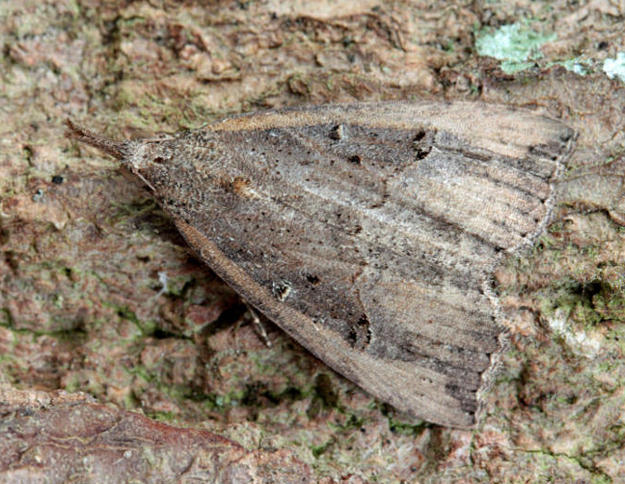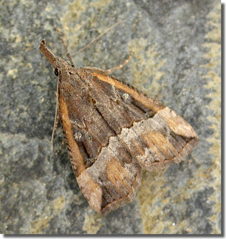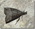 Bloxworth Snout H. obsitalis, which has the forewing more pointed and broader, with a conspicuous white patch below the costa outside the median fascia, followed by horizontal dashes (MBGBI Vol 10). Larva feeds on Hop.
