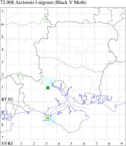 Rare immigrant from mainland Europe, with four records (excluding a few rather vague 19th Century records, and records associated with a breeding population that was present in VC18 from 1947 to 1960). The four primary immigrant records all occurred during July from VC19 in 1904, VC13 in 1946, VC16 in 2006 and the first in our area, from Totland, Wight on 4 July 2015. The first for Hampshire was a very worn specimen, presumably a migrant, that was trapped at light in Woodlands, New Forest in 2024. Wingspan 52-56 mm. Forewing with a very prominent black V-shaped mark at end of cell (MBGBI Vol 9). Larva feeds on English Elm and Wych Elm.