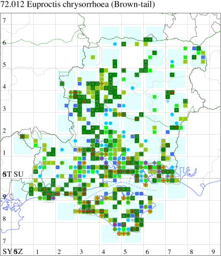 Local in scrub, hedgerows, parks and gardens, along the coasts on England from Yorkshire to the Isles of Scilly. In Hampshire and on the Isle of Wight formerly confined to a few coastal localities, notably Hayling Island, this species has recently and suddenly greatly increased its range. Larval nests are now plentiful in winter along the coast, mainly on hawthorn, bramble and blackthorn, and it is extending its range inland. Wingspan male 36-42 mm, female 39-41 mm. Larva feeds on Bramble, Hawthorn, Blackthorn, Dog-rose and Sallow, living gregariously within a silken web, causing sufficient damage to be a serious pest in some areas. The larval hairs are extremely irritating, causing rashes on exposed parts of the skin.