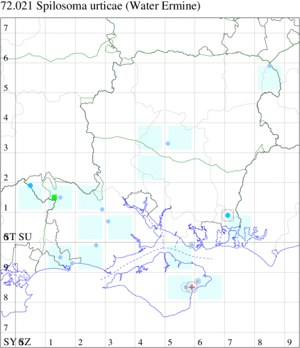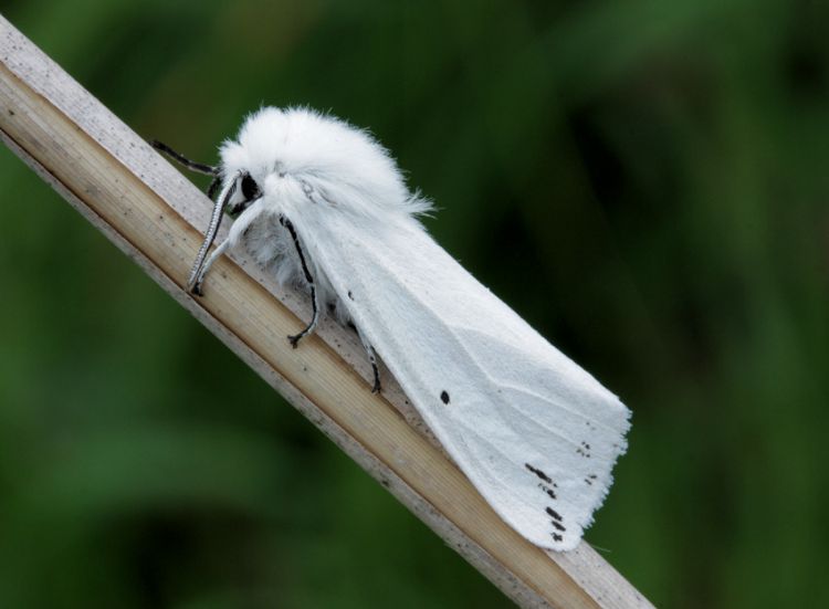 White Ermine S. lubricipeda, but Water Ermine has the wings pure white, with very few black dots on the forewing and the basal segment of the labial palpus yellow (MBGBI Vol 9). Also superficially similar to