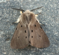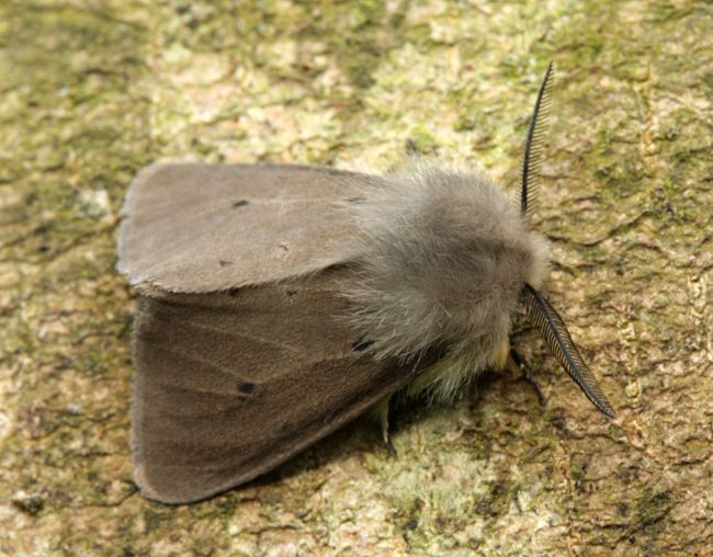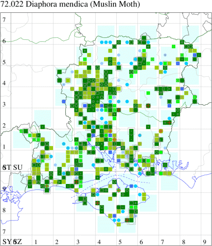 Common in open woodland, gardens and hedgerows, and on downland and sand-dunes throughout much of England, Wales and southern Scotland. In Hampshire and on the Isle of Wight widespread, but has declined recently. Wingspan male 30-35 mm, female 36-43 mm. The males are sometimes common at light, the females fly infrequently but are sometimes seen during the day. Male unmistakable, female is similar to White Ermine and Water Ermine, but smaller. Larva feeds on various herbaceous plants, including Dock and Dead-nettle, over-wintering as a pupa.