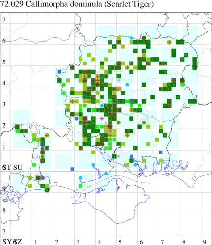 Local on river-banks, and in fens, marshes and damp meadows throughout south-western England and south Wales. In Hampshire still common in the Avon, Test, Itchen and Wey valleys and occasionally wanders elsewhere. Not recorded from the Isle of Wight to date. Wingspan 52-58 mm. Day-flying, but fairly frequent at over-night light traps. Usually, the bright red underwing precludes confusion with other tiger moths, however it occasionally has a yellow underwing, when it superficially resembles