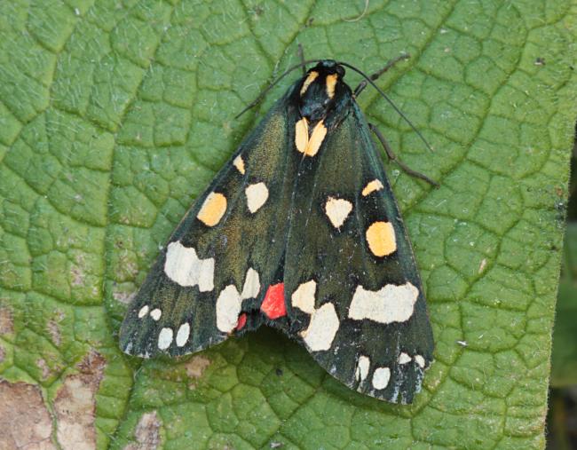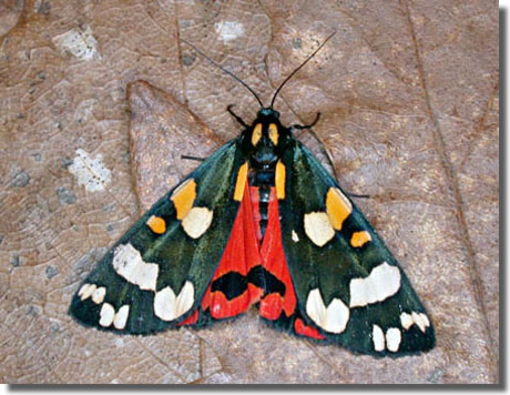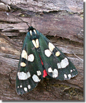 Cream-spot Tiger Arctia villica, but Cream-spot Tiger has a large white basal patch and is a more slender moth. Larva feeds on Common Comfrey, Hemp-agrimony, Stinging Nettle, Bramble, Honeysuckle and Meadowsweet.