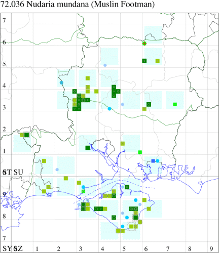 Local in dry-stone walls and rocky areas throughout much of the British Isles. In Hampshire and on the Isle of Wight very local and uncommon in the area. There are very scattered records from all three vice-counties. Wingspan 19-23 mm. The most likely confusion species is Round-winged Muslin Thumatha senex, which see for differences. Larva feeds on various lichens, often on walls.