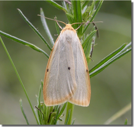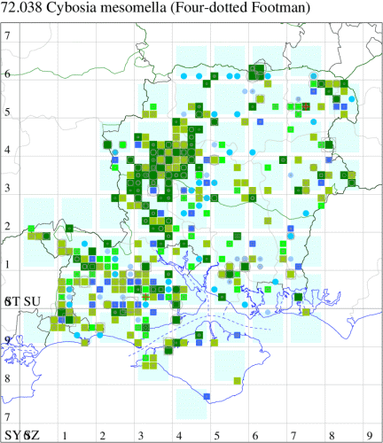 Local on heathland, moorland, damp grassland, fens and open woodland throughout the British Isles. Widespread and fairly common in Hampshire and on the Isle of Wight. Wingspan 29-34 mm. Unmistakable. Larva feeds on lichens growing on various woody plants, including Heather and Sallow.