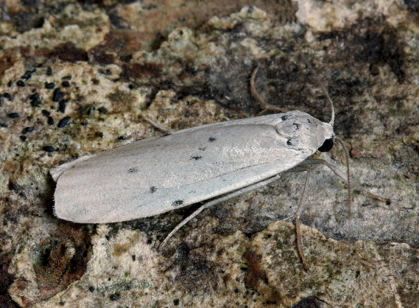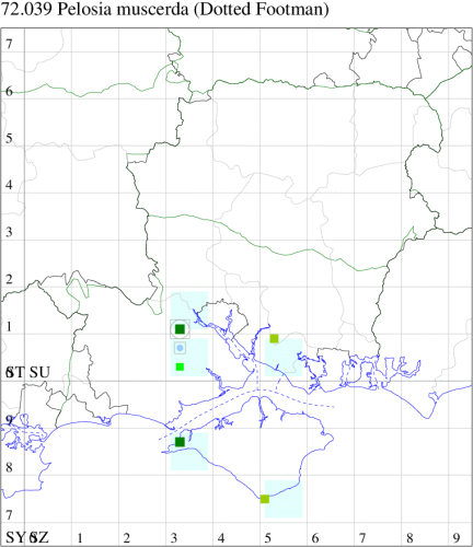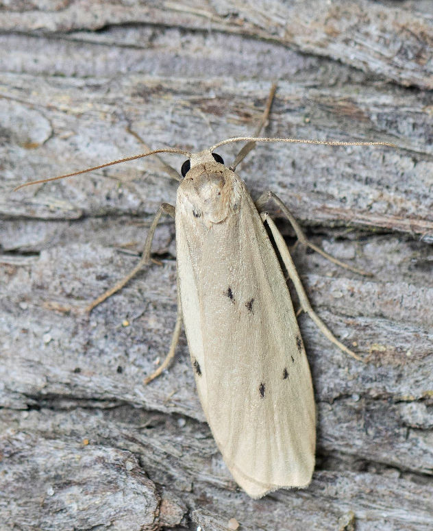 Small Dotted Footman P. obtusa, which is smaller, has more rounded wings and a very curved median row of black dots from costa to dorsum (MBGBI Vol 9). Larva feeds on various lichens.