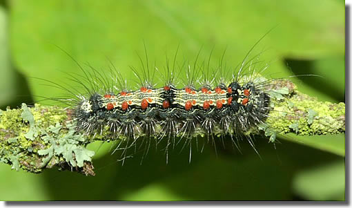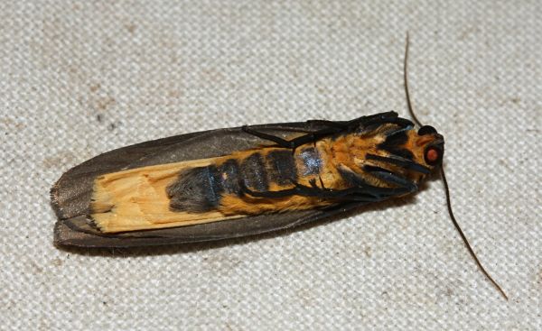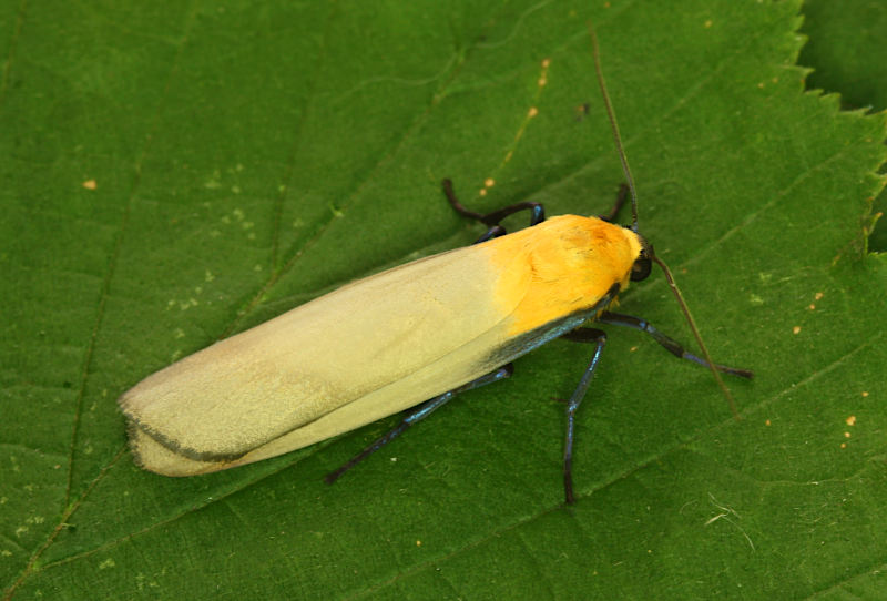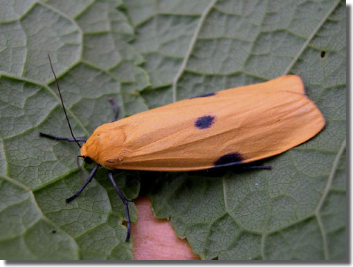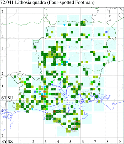 Local in broad-leaved woodland in southern England and western Wales, sporadically as far north as Ross-shire and the Isle of Man. It is probable that the population is from time to time reinforced by immigration. In Hampshire and on the Isle of Wight resident at low density in the New Forest and an uncommon, presumed, immigrant elsewhere. The individual pictured here was taken in the Isles of Scilly, where it is much more frequent. Wingspan male 35-40 mm, female 40-55 mm. Although only the female has spots, the large size precludes confusion with other Lithosiinae. The unspotted male is much more common to light then the female. Larva feeds on lichens growing on oak trees.
