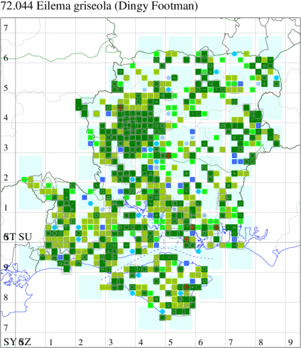 Common in fens, water meadows, damp grassland and rural gardens throughout southern England and Wales, north to Yorkshire. Widespread and common in Hampshire and on the Isle of Wight. Wingspan 32-40 mm. Either plain straw yellow (ab.