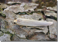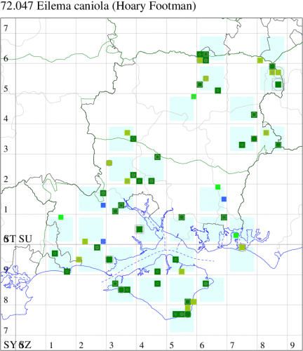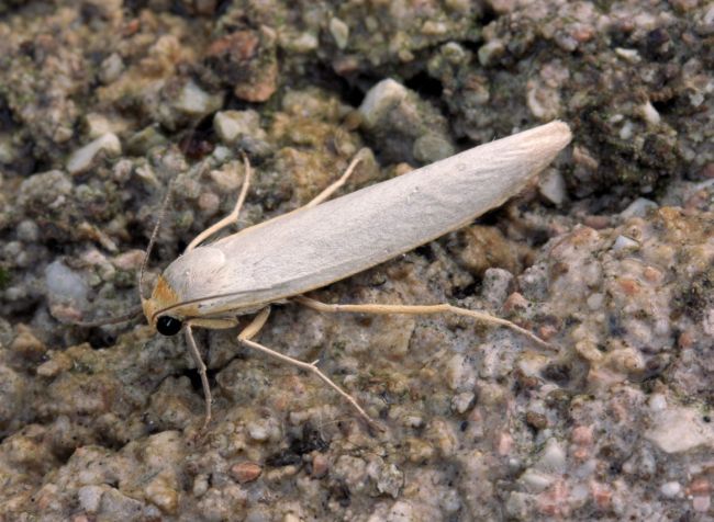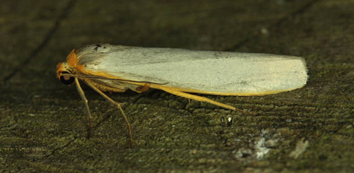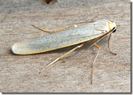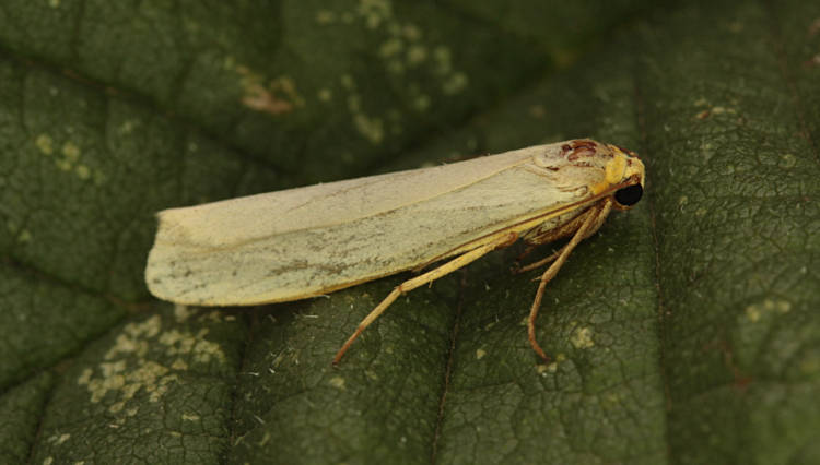 Scarce Footman E. complana, but hindwing very pale yellowish grey (ochreous yellow in Scarce Footman), a feature which is difficult to see on live specimens. Larva feeds on various lichens, often on rocks.