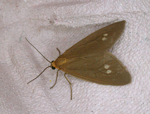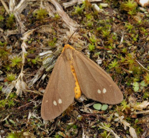 Occurrence in the British Isles unconfirmed, this southern European species is included on the British list on the basis of a single example, reportedly captured near Worthing, Sussex, which was exhibited at a meeting of the Entomological Society in 1867. Wingspan 22-25 mm. Fairly unmistakable, but voucher specimen should be retained for confirmation of identification. Larva feeds on various lichens and decaying vegetable matter, no evidence of breeding in the UK.