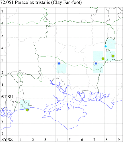 Nationally scarce (Na) in broad-leaved woodland throughout much of south-eastern England from Kent to Wiltshire, a priority species under the UK Biodiversity Action Plan, thought to be in decline due to changes in management of woodland, especially cessation of coppicing. In Hampshire first recorded in 1971 at Alice Holt, and only two records since; its true status remains a mystery, but it is obviously extremely rare. Not recorded from the Isle of Wight to date. Wingspan 28-31 mm. Main confusion species is