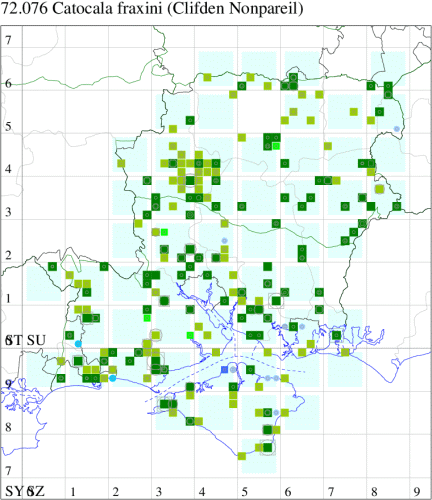 A species that was a rare immigrant, temporarily established in Kent and the Norfolk Broads in the past, but which since c. 2005 now appears be making a comeback as a resident species in places. In Hampshire and on the Isle of Wight historically a rare immigrant with up to 1995 about twenty records altogether. Since 2006, the species has started to be recorded more regularly, for example, at Ventnor and Totland on the Island, and at Brockenhurst in the New Forest, and sightings have increased year on year. It is almost certainly resident in a number of localities across southern England (including our area) and while there is the possibility that some of these individuals may have originally originated from deliberate release of captive stock, it is most likely that most populations originate from migrants remaining to breed in this country. Wingspan male 84-100 mm, female 98-112 mm. The original name for this species, Blue Underwing, sums up the identification criteria nicely! Larva feeds on Aspen, no evidence of breeding in the UK.
