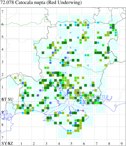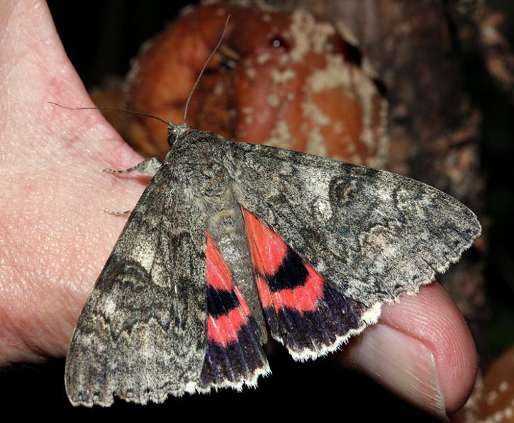 Catocala group, but less so than formerly. Not particularly attracted to light, which may result in it being under-recorded, but it isn't seen by day resting on tree-trunks in the profusion of a few decades back. Wingspan 75-94 mm. The most likely confusion species are the very much less common