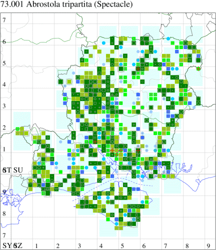 Common in gardens, heathland, rough grassland, fens, woodland edges and waste ground throughout the British Isles. Widespread and common in Hampshire and on the Isle of Wight. Wingspan 34-38 mm. The main confusion species is Dark Spectacle A. triplasia, which see. Larva feeds on Stinging Nettle, over-wintering as a pupa.