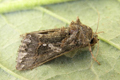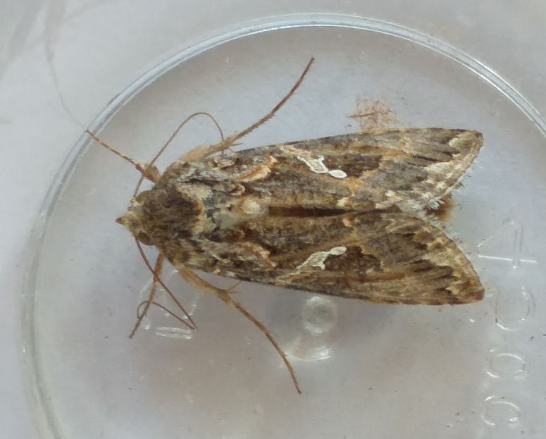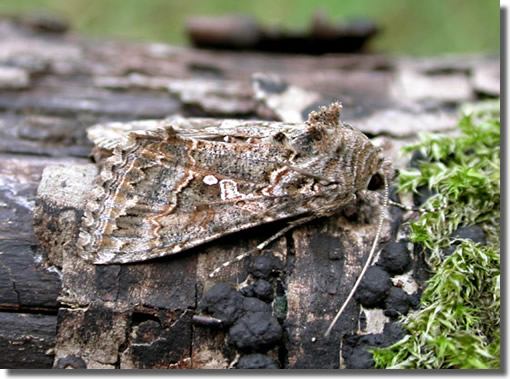 Silver Y Autographa gamma, which has the silver Y mark unbroken (in Ni Moth, the tail of the Y is detached from the body), and the much darker