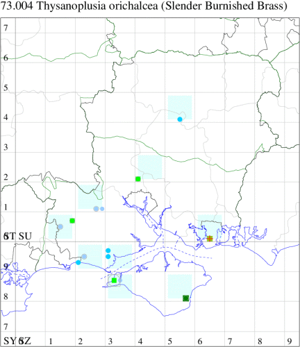 Burnished Brass Diachrysia chrysitis has the thorax and abdomen stouter and forewing broader, with basal portion of the metallic patch extending from costa to dorsum; in Slender Burnished Brass most of the forewing is filled by a triangular greenish-brassy area, narrowly bordered at termen, more broadly at costa and dorsum, with pale purplish grey (MBGBI Vol 10). Larva polyphagous, no evidence of breeding in the UK.