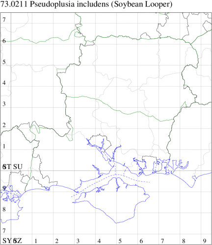 Silver Y Autographa gamma, but the gamma is split in two parts. It is unlikely that records of this species will be accepted unless the specimen is retained for examination. Larva feeds on crops such as Sweet Potato, Tomato, Tobacco and Cotton, causing sufficient damage to be a serious pest in some areas, no evidence of breeding in the UK.