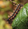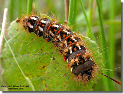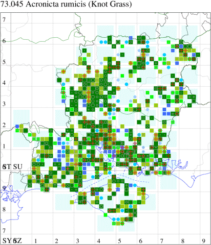 Common on grassland, heathland, marshes, gardens and a wide range of other habitats throughout much of the British Isles. In Hampshire and on the Isle of Wight widespread and common in all three vice-counties. Wingspan 35-43 mm. Superficially similar to other Acronicta species, it can usually be distinguished by the curved white mark near the rear edge of the forewing, which is normally present even in melanic specimens. Larva feeds on various herbaceous and woody plants, including Broad-leaved Dock, Common Sorrel, Ribwort Plantain, Greater Plantain, Water Mint, Bramble, Hop, Hawthorn and Burnet Rose, over-wintering as a pupa.