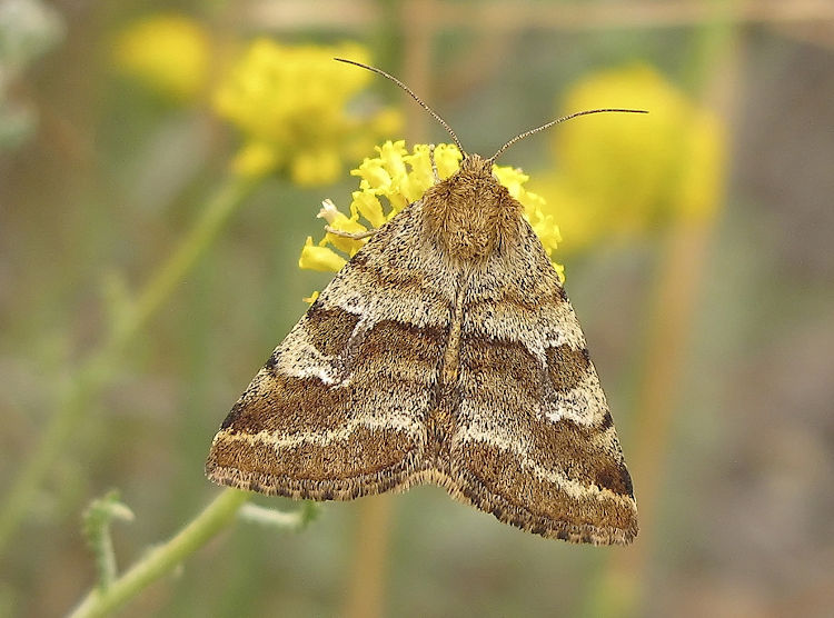 Burnet Companion Euclidia glyphica, which is smaller, with forewing dark brown and hindwing with strong black basal suffusion (MBGBI Vol 10). Larva feeds on Pitch Trefoil, which does not occur in Britain.
