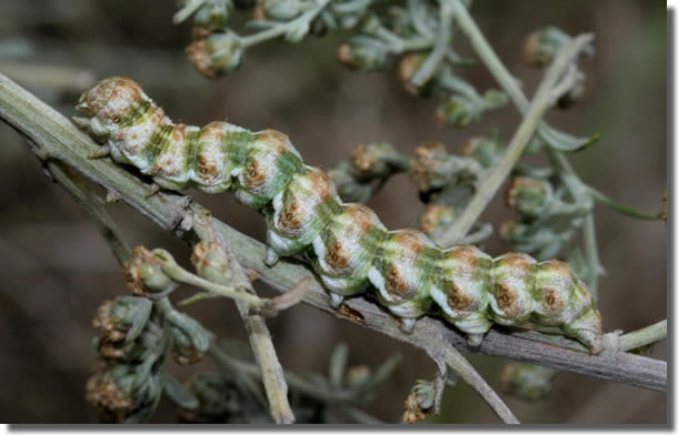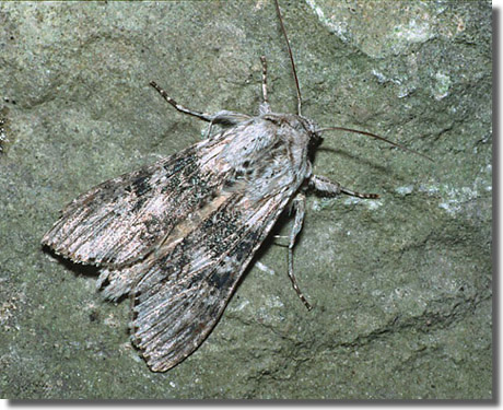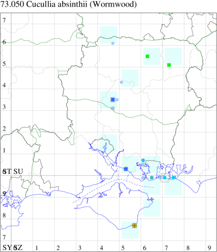 Scarce Wormwood Cucullia artemisiae, but this species lacks the figure 8 in the stigmata, which are edged with black instead of white, and has narrower forewings with brownish rather than black suffusion (MBGBI Vol 10). Larva feeds on flowers and seedheads of Wormwood, over-wintering as a pupa.