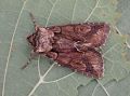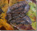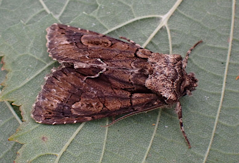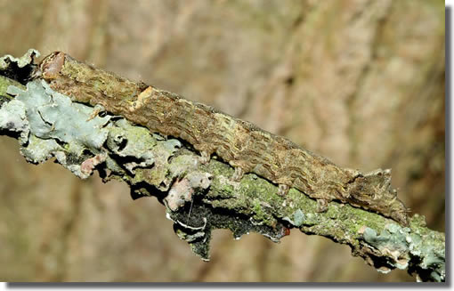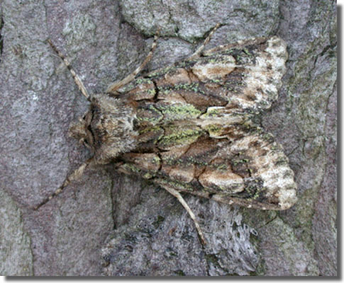 Common in broad-leaved woodland, scrub, hedgerows and gardens throughout the British Isles, a species of conservation concern under the UK Biodiversity Action Plan. In Hampshire and on the Isle of Wight widely distributed, but not particularly common. Wingspan 38-48 mm. Occurs in two forms, and their intermediates, in any shade on a scale from green to brown, but always easy to recognise and unlike any other British moth. Larva feeds on Hawthorn and Blackthorn and, less frequently, other broad-leaved trees and shrubs.