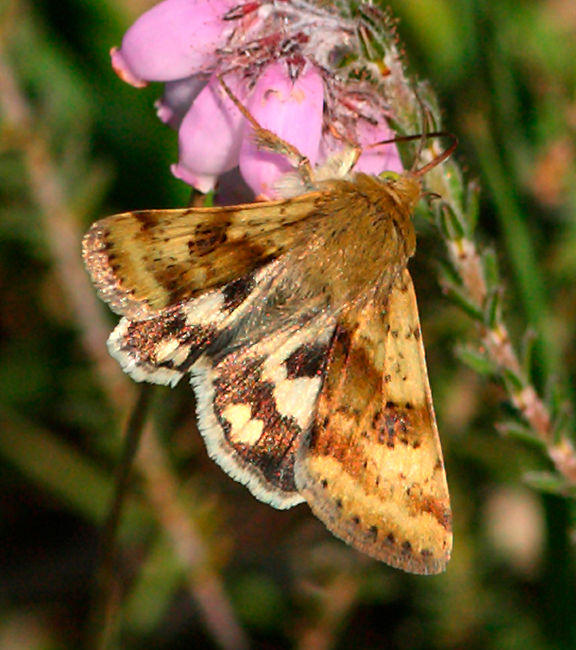 A rare Red Data Book and a priority species under the UK Biodiversity Action Plan, now confined to acid heathland in Hampshire and neighbouring counties. In Hampshire more or less confined to the New Forest, where it occurs on damp heathland, although recent records have been few, with none since 1999. Recorded on the Isle of Wight for the first, and so far only, time at Freshwater in 1985. The south-eastern European subspecies has been recorded as a rare migrant in south-east Kent. Wingspan 32-37 mm. Day-flying, may come to light. The main confusion species is